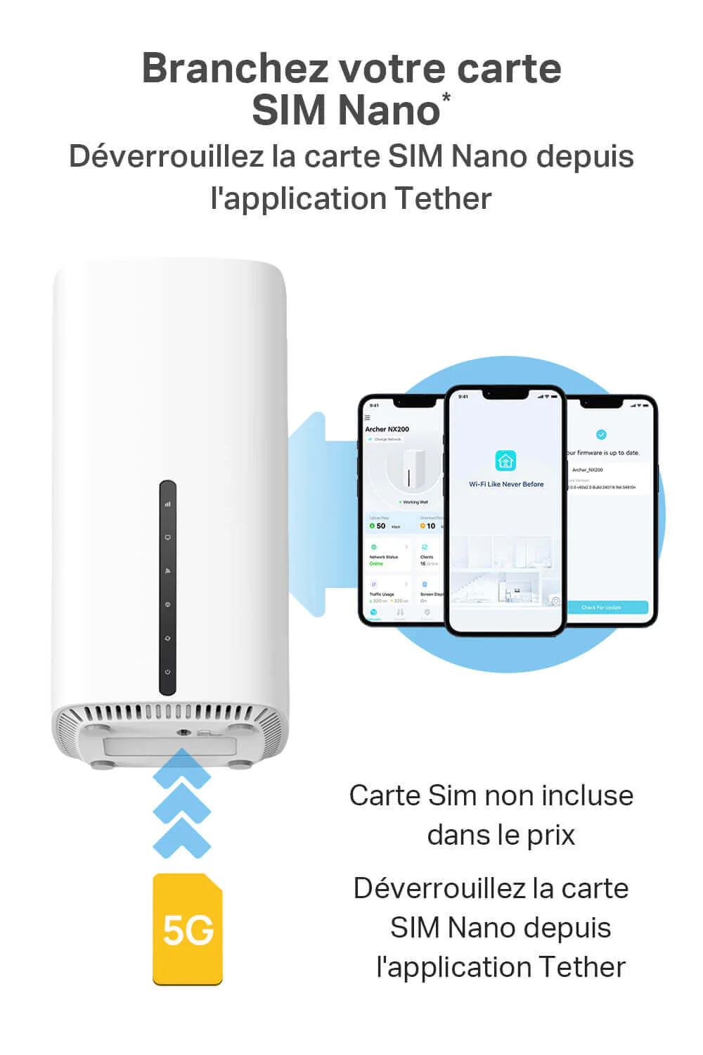 Avec ses vitesses impressionnantes allant jusqu'à 4,67 Gbps en 5G et ses débits Wi-Fi de 1201 Mbps sur la bande 5 GHz et 574 Mbps sur 2,4 GHz, l'Archer NX200 garantit une connectivité fluide pour tous vos appareils. Sa compatibilité multi-réseaux (5G, 4G et haut débit traditionnel) en fait une solution adaptable à toutes les situations.