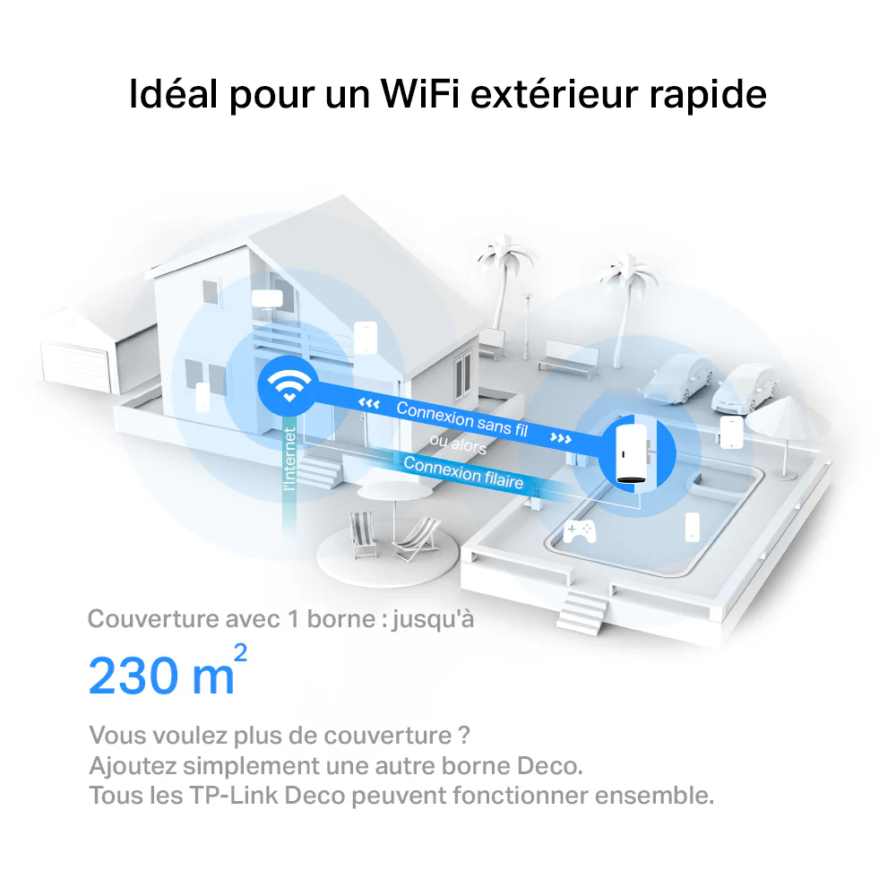 Le Deco X50 Outdoor s'adapte à votre environnement avec ses options de montage mural, sur poteau ou sur table. Ses deux ports Ethernet Gigabit avec prise en charge PoE simplifient l'installation et l'alimentation. La gestion du réseau se fait aisément via l'application TP-Link Deco, compatible iOS et Android.