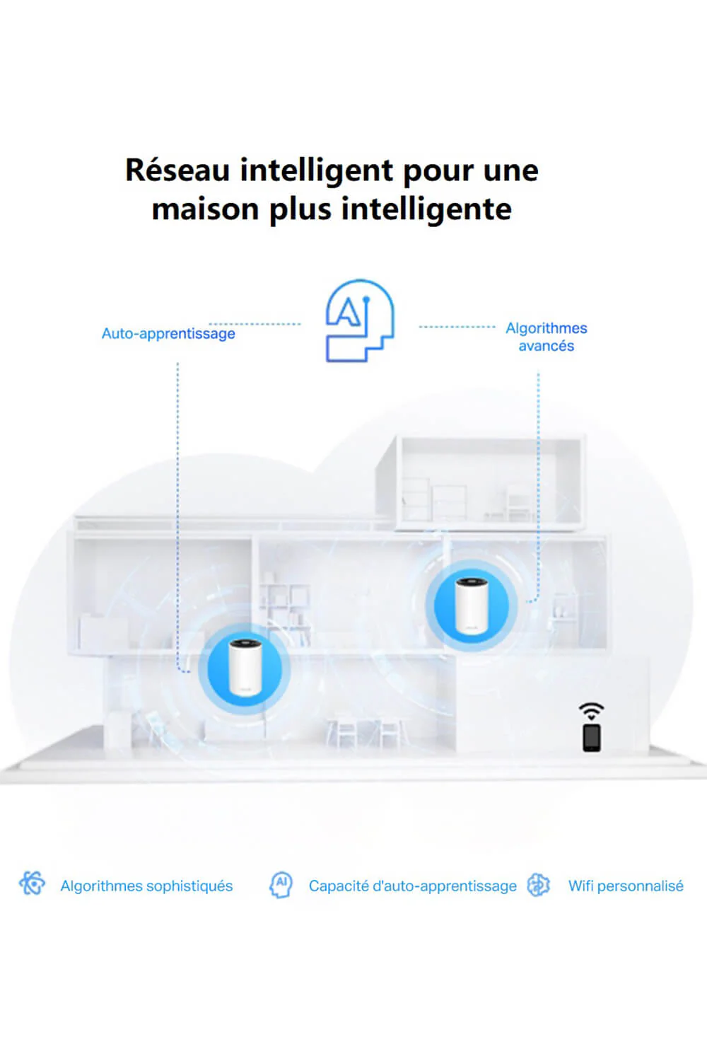 Doté d'un processeur Quad-Core à 1,7 GHz, le système utilise l'intelligence artificielle pour optimiser votre réseau. La technologie Mesh assure une transition transparente entre les modules, tandis que le protocole WPA3 et le pare-feu intégré protègent vos données.