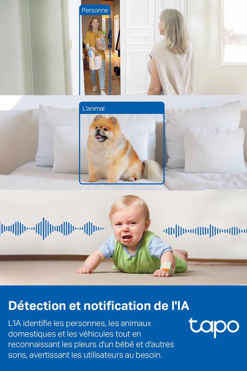 La caméra Tapo C125 redéfinit la surveillance intérieure avec sa résolution Quad HD 2K (2560 x 1440 pixels) et sa détection IA sophistiquée. Cette technologie de pointe distingue avec précision les personnes, les animaux et les véhicules, vous offrant des notifications personnalisées en temps réel. Vous restez ainsi informé des mouvements pertinents, évitant les fausses alertes et assurant une surveillance ciblée de votre domicile.