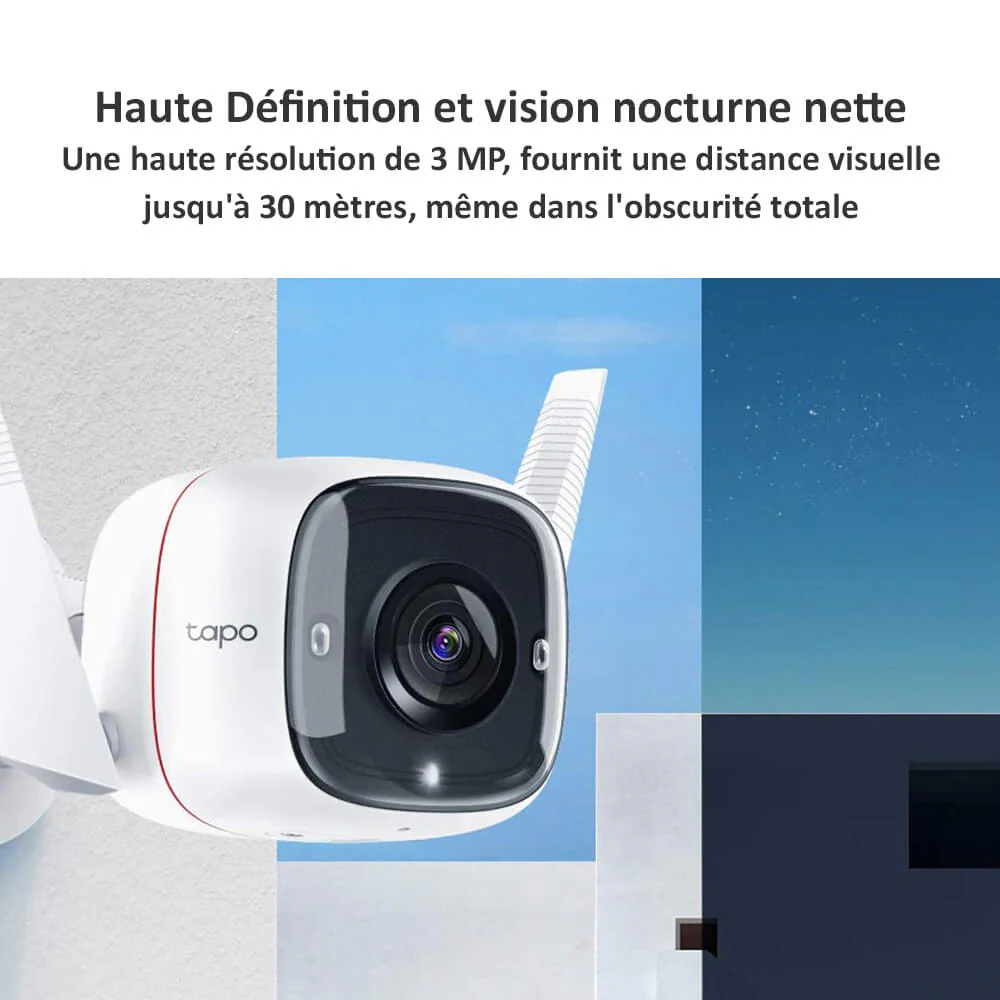 La caméra de surveillance extérieure Tapo C310 offre une protection avancée pour votre domicile. Avec sa résolution ultra-haute définition de 3MP (2304 x 1296 pixels), elle capture des images d'une netteté exceptionnelle, vous permettant d'identifier clairement les détails importants. Sa vision nocturne avancée, portant jusqu'à 30 mètres, assure une surveillance efficace 24h/24, tandis que son boîtier robuste certifié IP66 résiste aux intempéries pour une utilisation fiable en extérieur.