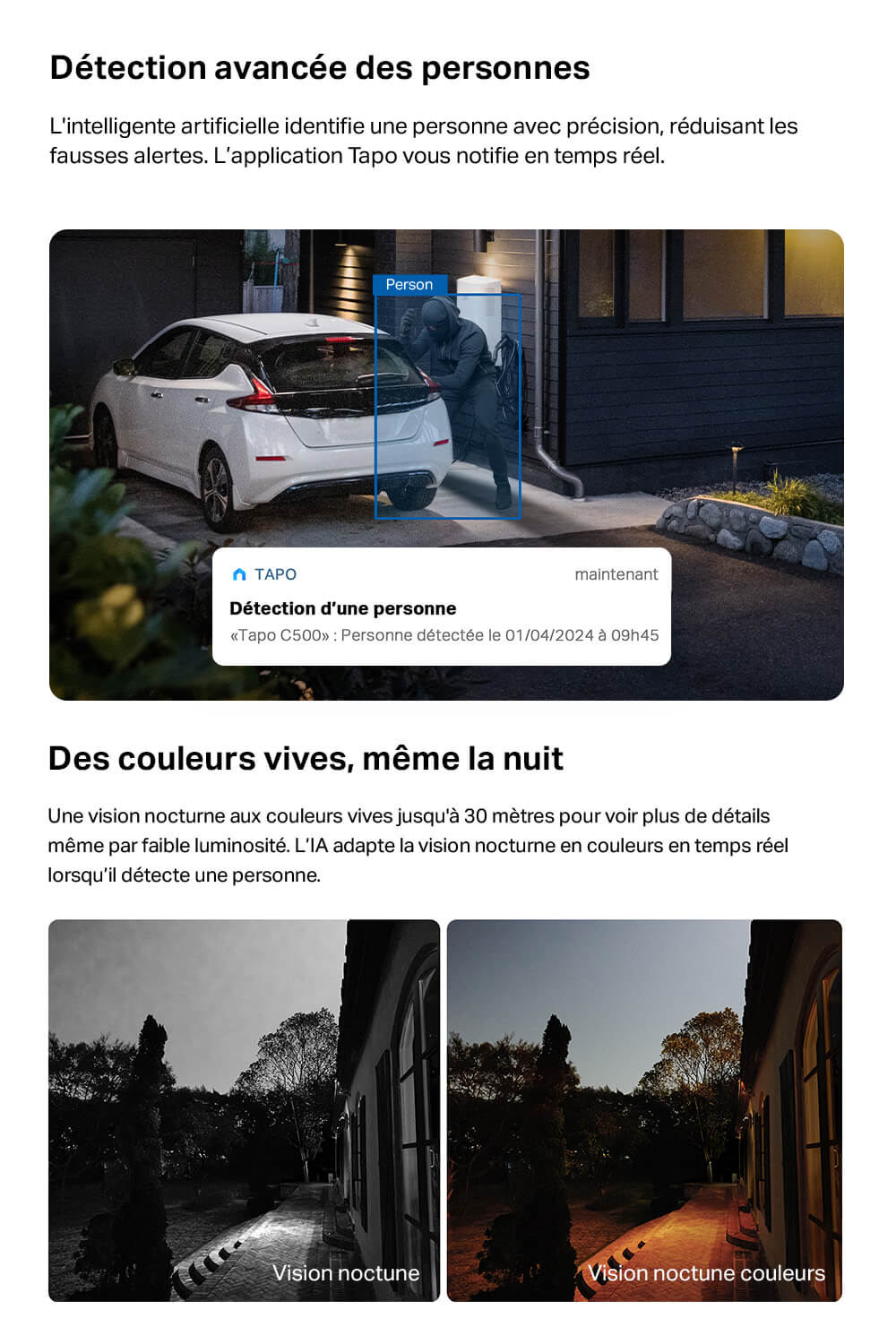 Équipée d'une résolution Full HD 1080p, la Tapo C500 capture des images d'une netteté remarquable. Que ce soit en plein jour ou dans l'obscurité totale, cette caméra ne manque aucun détail. Sa vision nocturne infrarouge portant jusqu'à 30 mètres garantit une surveillance efficace 24h/24, 7j/7, vous permettant de dormir sur vos deux oreilles.