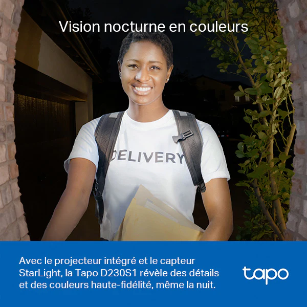 La sonnette vidéo connectée Tapo D230S1 offre une qualité d'image exceptionnelle en 2K (2560 x 1920 pixels), vous permettant de voir chaque détail avec clarté. Grâce à son capteur starlight et son projecteur intégré, elle assure une vision nocturne en couleur, garantissant une surveillance efficace 24h/24. Son angle de vue ultra-large de 160° en diagonale vous permet d'observer vos visiteurs de la tête aux pieds, même à courte distance, pour une sécurité optimale de votre domicile.