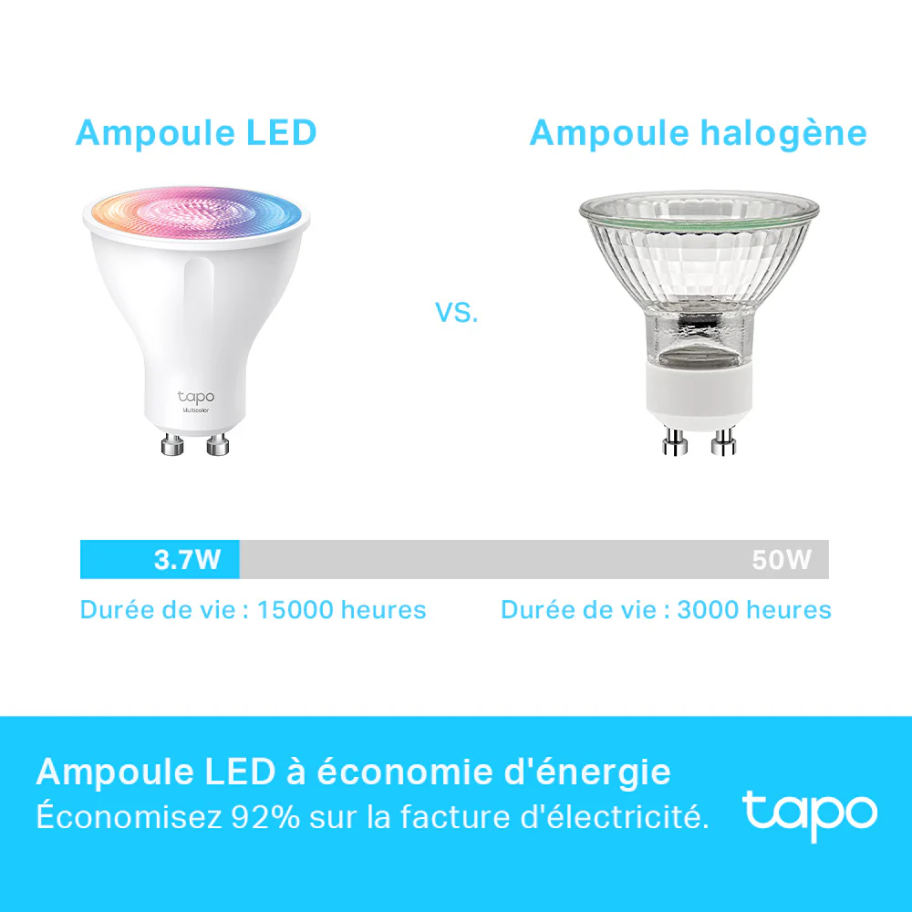 L'Ampoule LED Connectée GU10 Tapo L610 est un spot LED intelligent à intensité variable, conçu par la marque Tapo (TP-Link). Fonctionnant en Wi-Fi (2,4 GHz), elle s'installe rapidement sans hub supplémentaire et se contrôle à distance via l'application Tapo ainsi que par la voix (Amazon Alexa, Google Assistant). D’une puissance de 2,9 W, elle offre un flux lumineux de 350 lumens, équivalent à une ampoule 50 W, avec une lumière blanc chaud de 2700K (angle 40°) idéale pour créer une ambiance chaleureuse à la maison. Compatible avec les luminaires GU10 standards, elle propose la gestion du planning d’allumage, la variation de la luminosité de 1 à 100 %, la fonction de groupement avec d’autres ampoules Tapo et une très faible consommation (classe énergie D, veille <0,2 W). Sa durée de vie atteint 15 000 heures, pour 15 000 cycles d’allumage. Elle est certifiée CE, ERP, RoHS et RCM. Dimensions : 50 mm de diamètre, 55,2 mm de longueur.