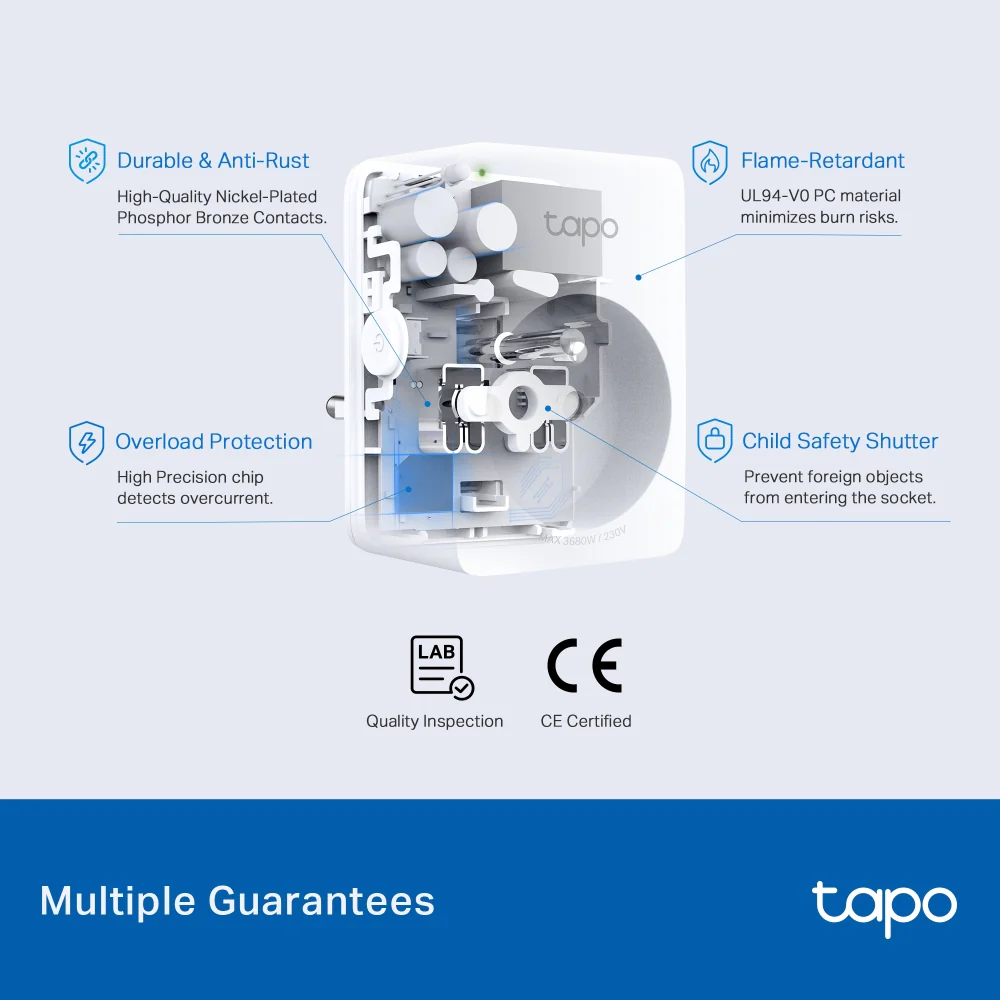 Les prises Tapo P110M offrent une capacité nominale de 16 A sous 100-240 V~ (50/60 Hz), une connectivité Wi-Fi IEEE 802.11b/g/n (2,4 GHz) et Bluetooth pour l’appairage, le tout dans un boîtier compact de 7,25 x 5,15 x 3,74 cm. Elles proposent un suivi de consommation en temps réel, une certification Matter pour une interopérabilité optimale, un fonctionnement local sans connexion Cloud et une protection multi-couches pour une sécurité renforcée.